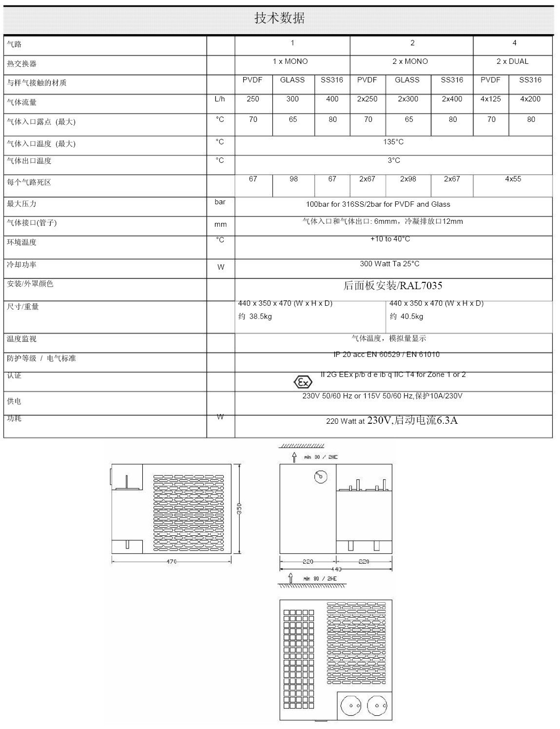 緊湊型和免維護(hù)防爆型冷凝器JCT-EX主要部件是高性能的熱交換器和精制的壓縮機(jī),用以調(diào)節(jié)冷卻系統(tǒng)。唯一的壓力和溫度控制電源調(diào)節(jié)、較高的應(yīng)用以及較好的部件,都有利于長(zhǎng)時(shí)間穩(wěn)定露點(diǎn)。熱交換器靈活的結(jié)構(gòu),允許高流量和保證樣氣和冷凝物適當(dāng)分離。JCT EX防爆型冷凝器提供穩(wěn)定可靠的技術(shù),耐腐蝕。可用于危險(xiǎn)區(qū)域如1區(qū) 或 2 區(qū),通過(guò)ATEX認(rèn)證。